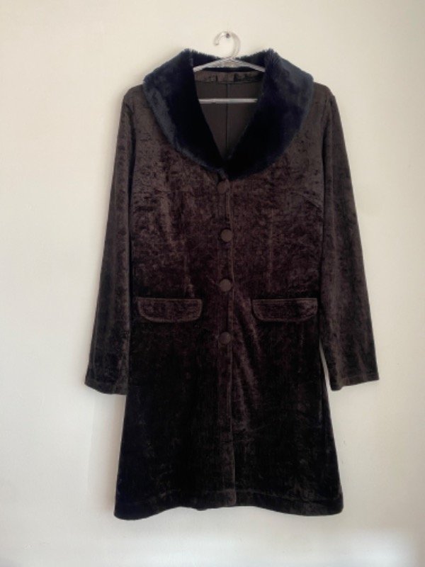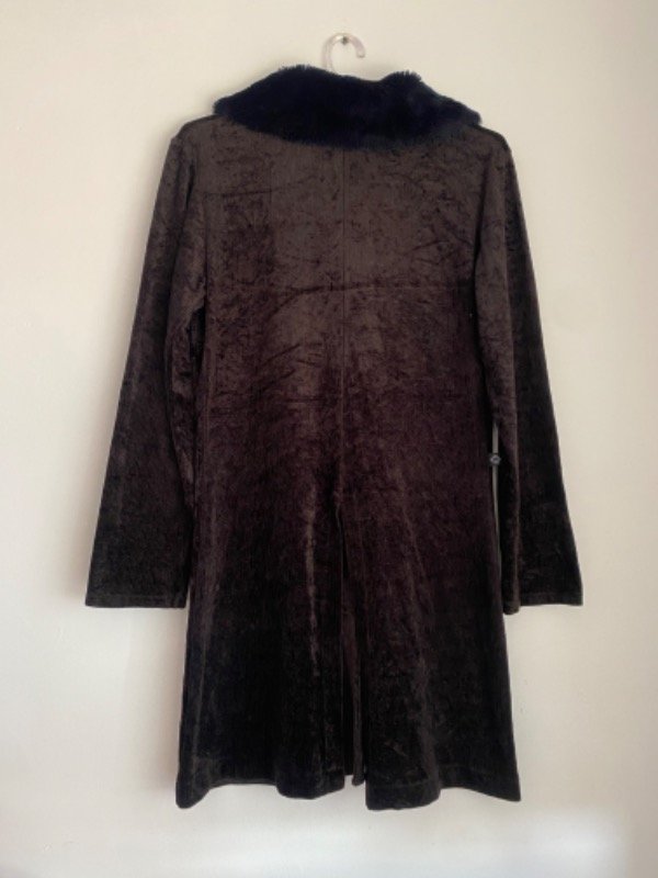 Saco largo con piel sintética en el cuello, la tela es una mezcla de pana liviana con textura como de chiffon al tacto, botones forrados y tajo en espalda,