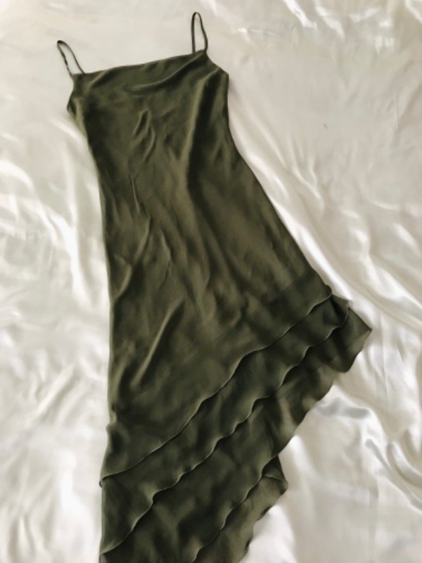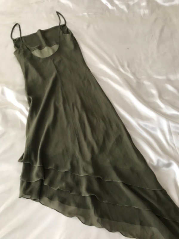 Vestido dosmilero de gasa forrado muy fairy, de tiritas , corte irregular tipo volado en pico, escote apenas volcado