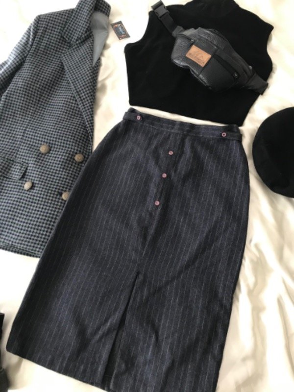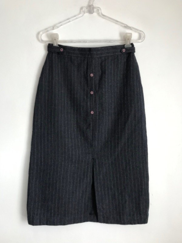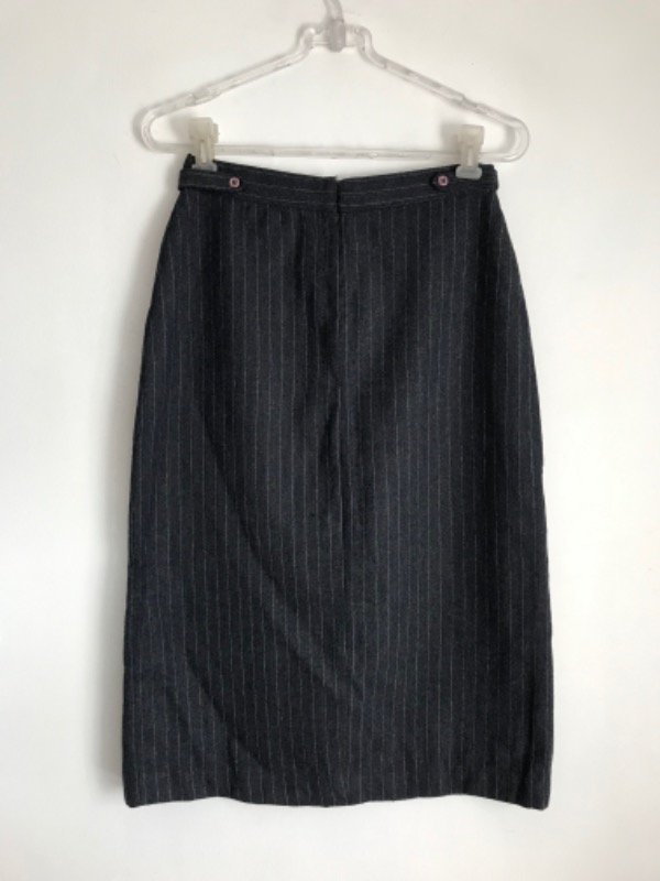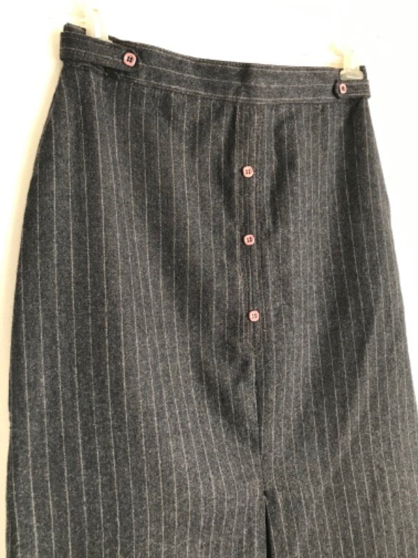 Falda gris con rayitas de paño liviano, largo medio, cintura alta con botones de vista, cierre atrás