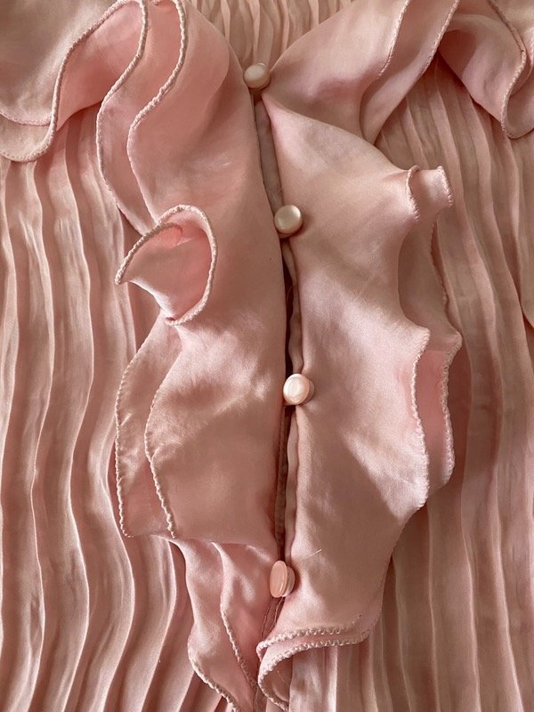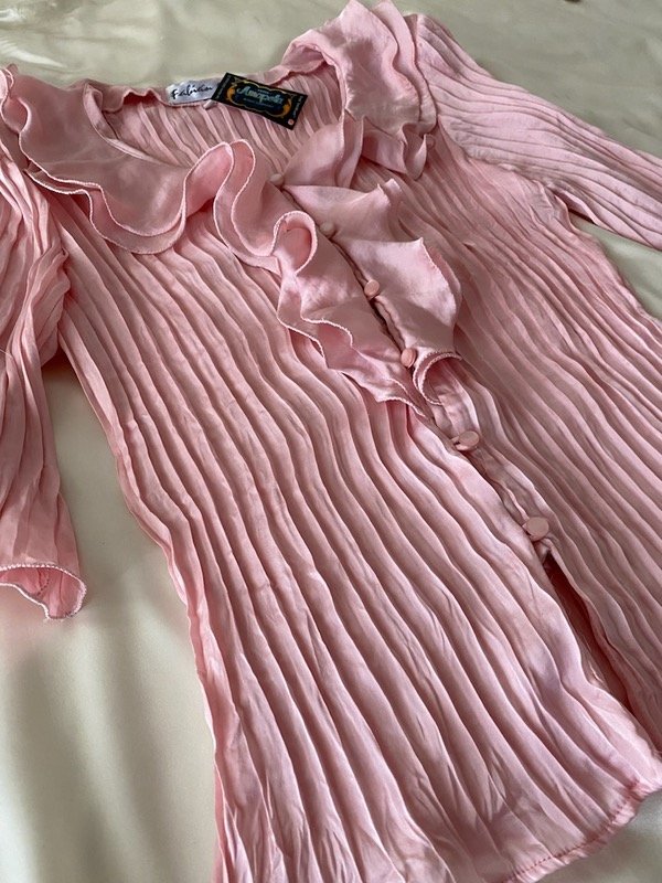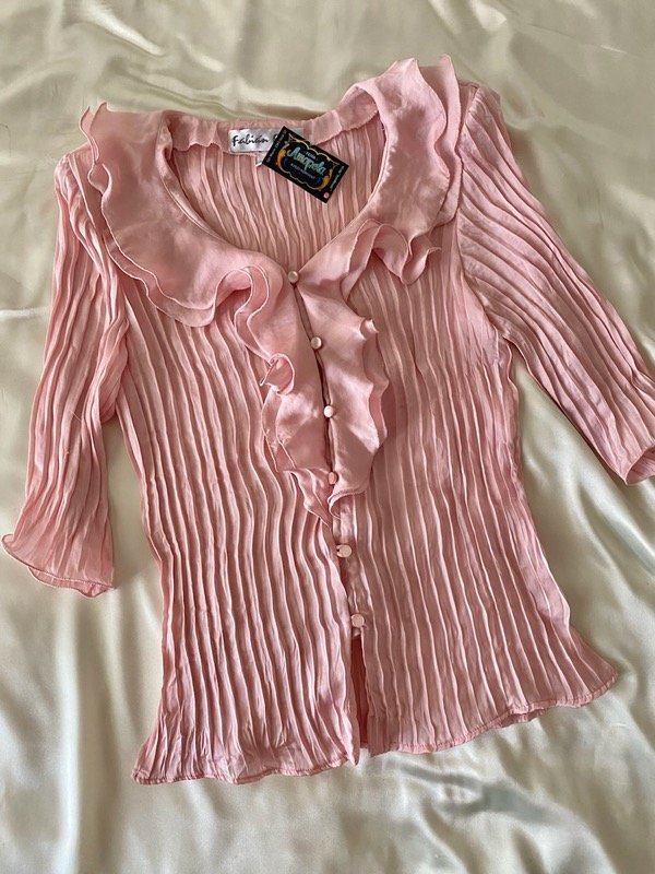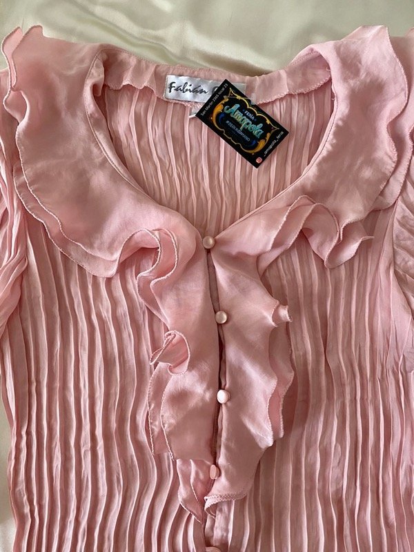 Blusa rosa plisada con volado y bellos botones, talle 2 según etiqueta
