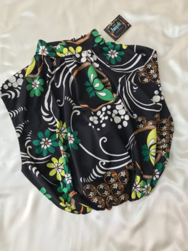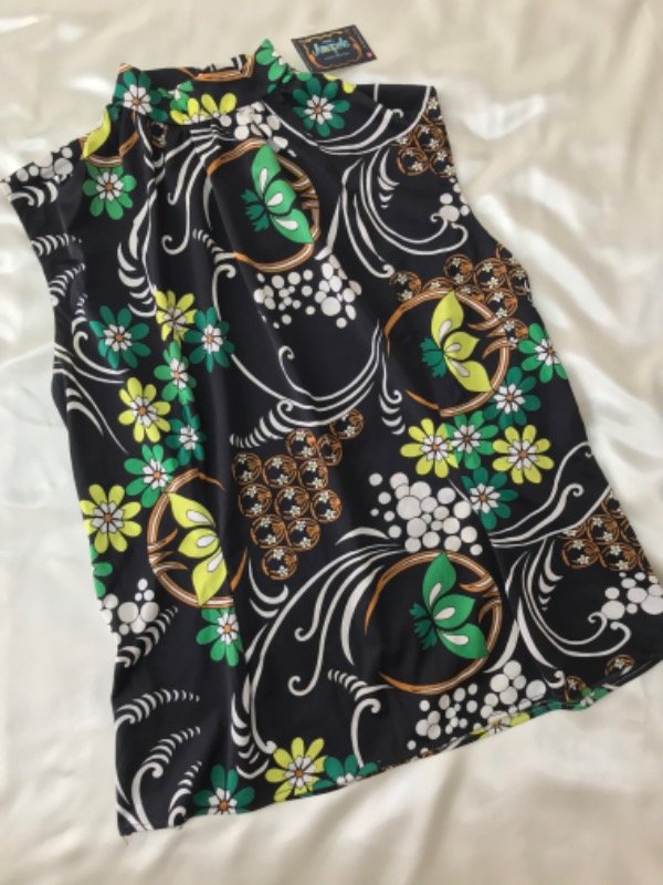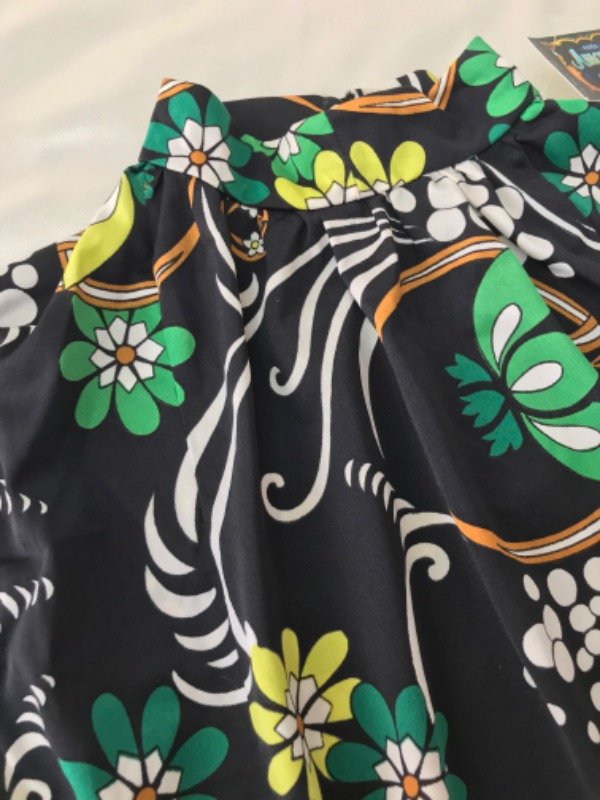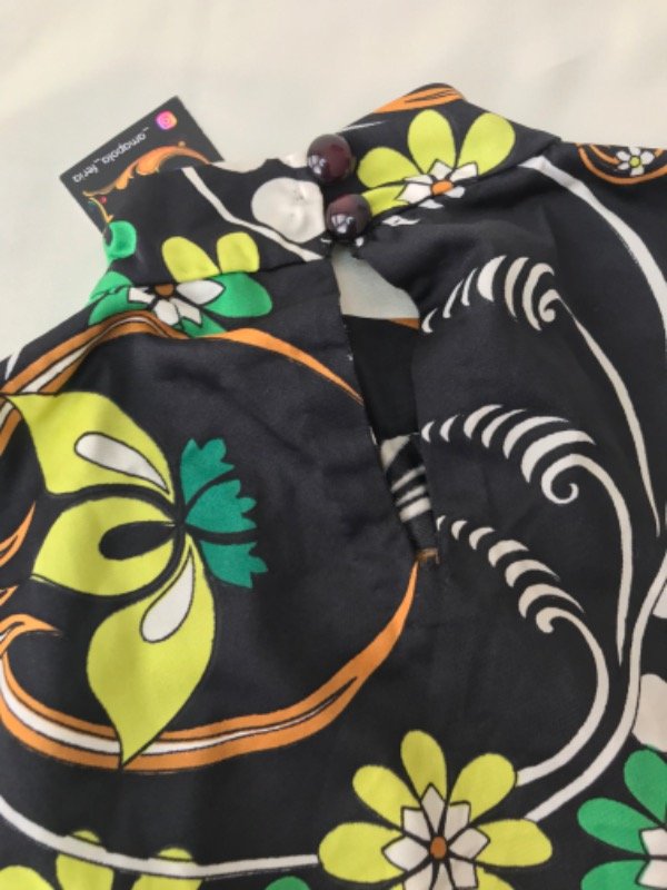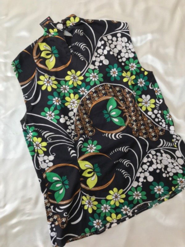 Blusita cuello alto con botones atrás en el cuello, estampado y tela super 70s,