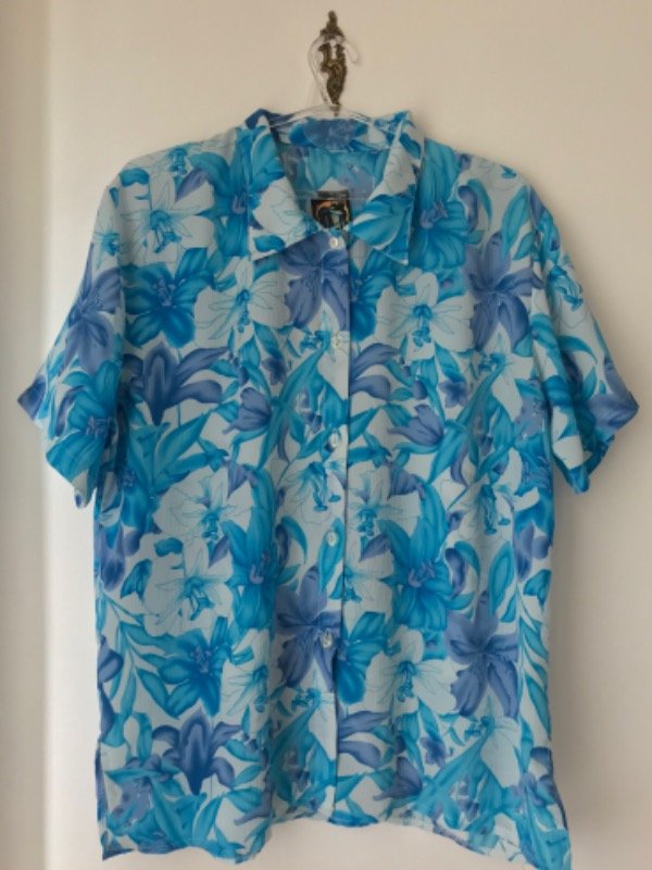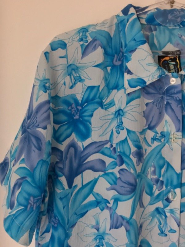 Camisa tipo hawaiana en turquesas,?tela arugadita simil bambula